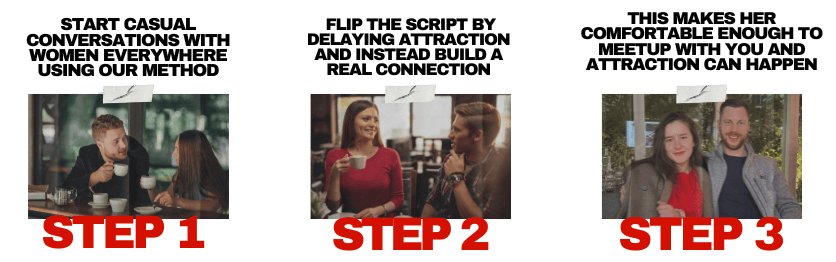 The Magnetic Conversations Method is a simple 3-step system that shows you how to get dates by focusing on building genuine connections instead of trying to attract women immediately.