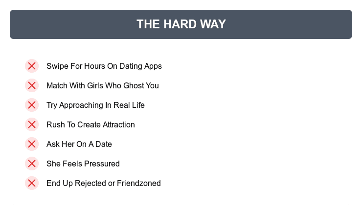 For any man who is tired of swiping on dating apps with barely any matches at all (or dealing with low quality women). We show you a different way to meet women in real life by purposely DELAYING attraction. This allows you to easily get dates with women where you attraction just happens naturally.
